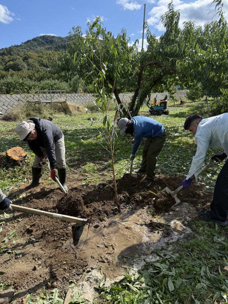 10月27日、抜けるような秋晴れの下、当園の畑で重要なプロジェクトが進行しました。長年、私たちに恵みをもたらしてくれた古い桃の木を伐採し、その場所に新たな苗木を植え付ける「改植」の作業をしました。
