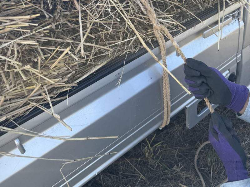 トラックの荷台いっぱいに藁を積み上げ、崩れないようロープで力強く縛る作業は、かなりの重労働。しかし、私たちにはこの疲れを吹き飛ばす「毎年のお楽しみ」があります。