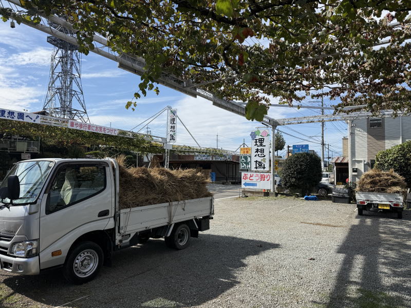 冬の足音が聞こえてくるこの季節、集めた藁は果樹の根元に敷き詰められ、厳しい寒さから木々を守る「防寒着」となります。そして時が経てば、そのまま豊かな土壌を作る堆肥へと変わる、果樹栽培になくてはならない大切な天然資材です。
