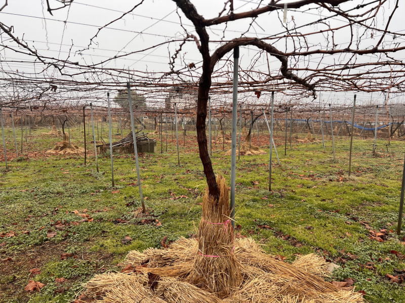 藁(わら)を巻いたブドウの木も、しっとりと濡れて土に馴染んでいます。 この雨が上がれば、寒さはさらに厳しくなるでしょう。しかし、今日の雨が大地に沁み込み、木々の生命力を底上げしてくれたはずです。