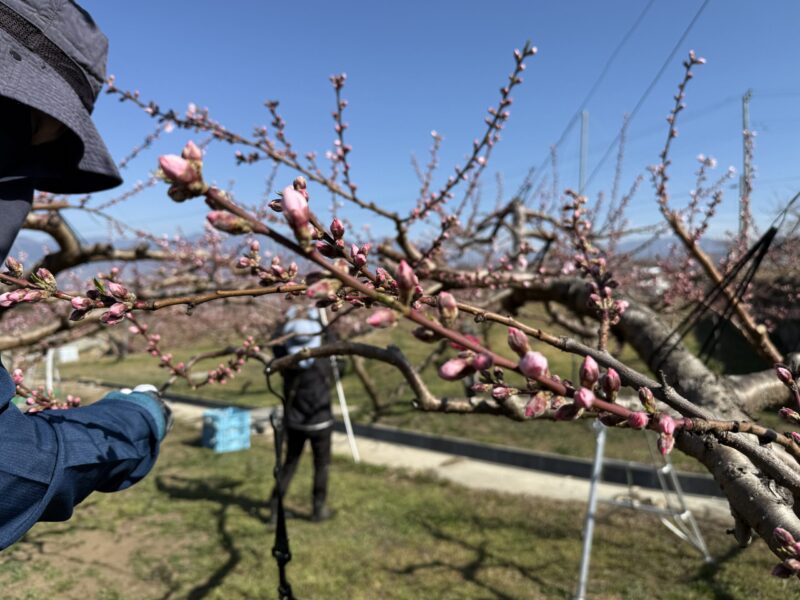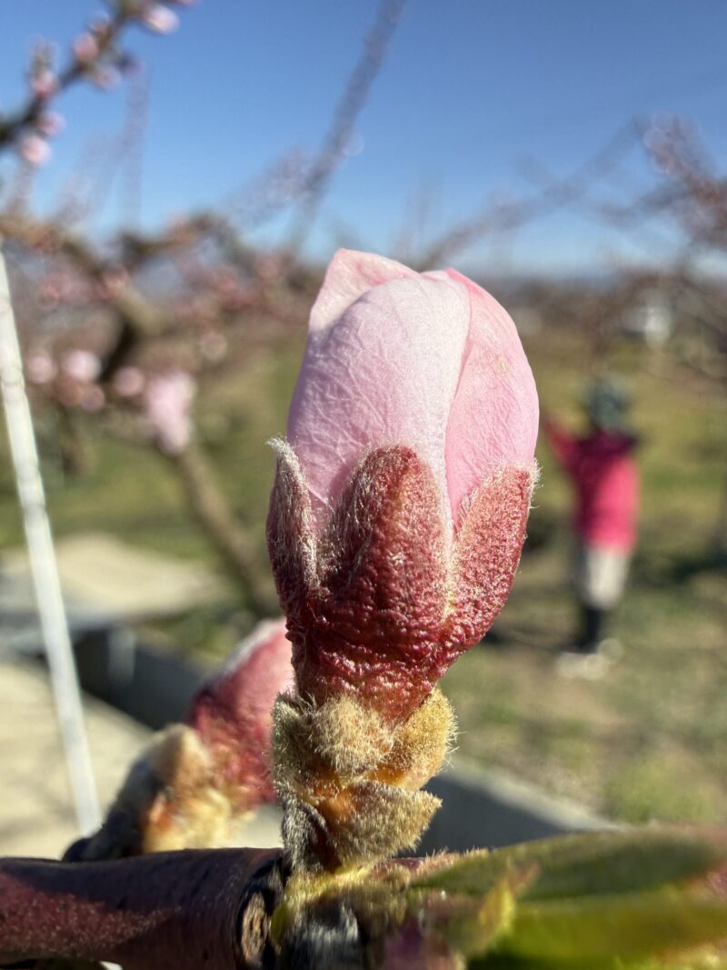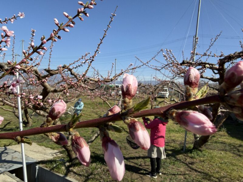 今回アップした写真をご覧いただくと、枝先に可愛らしいピンク色のつぼみがプックリと膨らんでいるのがわかると思います。ふっくらとして、桃の開花まで本当にあと少し!といった状態ですが、実は今、理想園ではスタッフ総出で大忙しの作業を行っています。